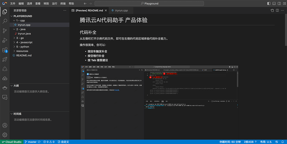 AI代码助手支持 Python, JavaScript/TypeScript, Java, C/C++, Go, C#, Rust, Swift, Lua, Kotlin, TSX/JSX, Vue, Proto, PHP 等语言/框架。