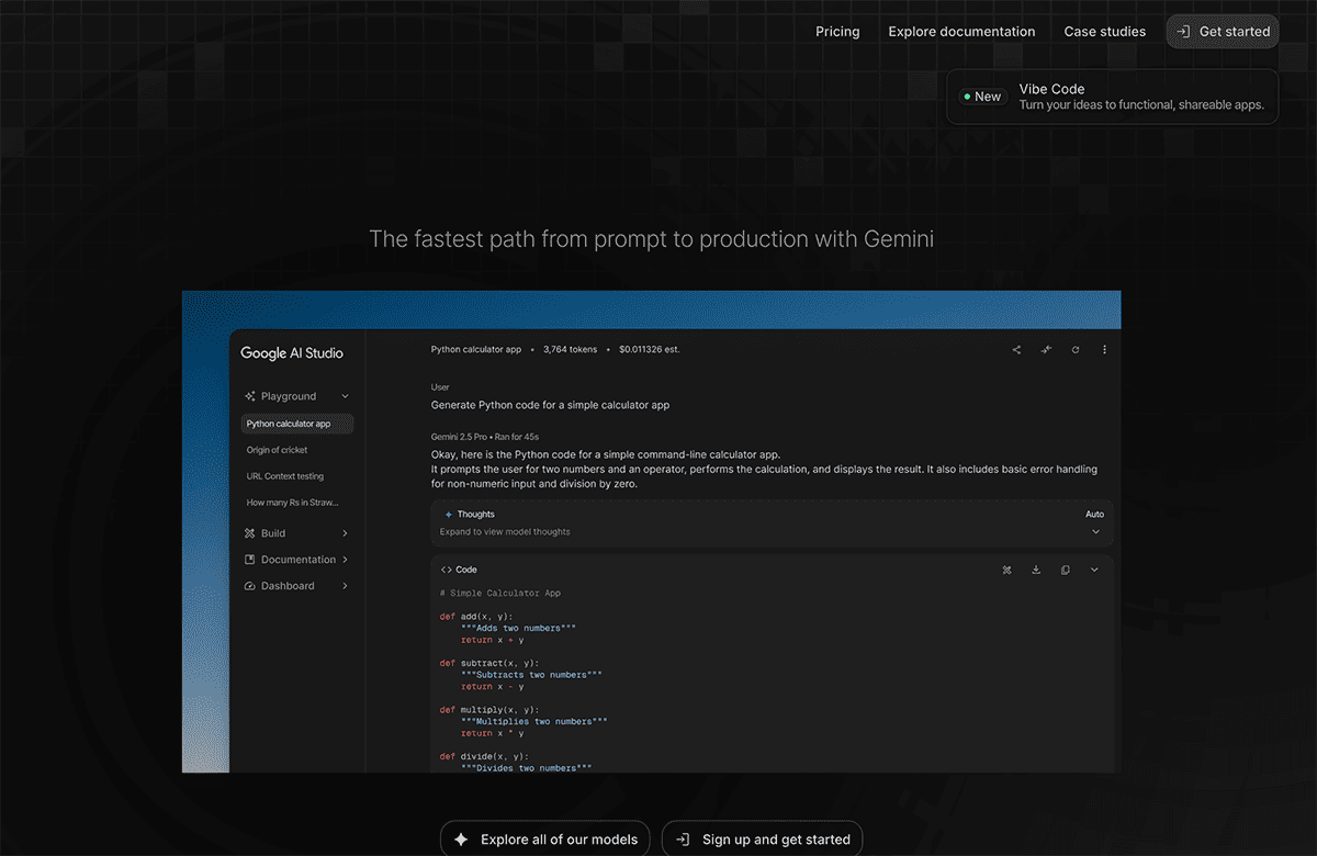 Google AI Studio 是 Google 推出的基于浏览器的集成开发环境(IDE),专为生成式人工智能模型(尤其是 Gemini 系列) 的原型设计、实验和快速部署而打造。Google AI Studio 致力于打造面向所有技术层级用户的“一站式”AI实验平台,可以帮助用户在几分钟内完成从 Prompt 编写、模型交互到代码导出、部署的全链路工作,尤其适合想要快速尝试 Gemini 系列生成式模型的个人或团队。